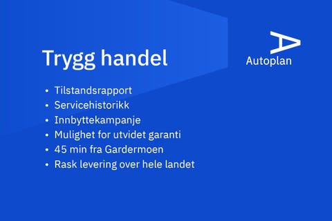 Bilen er klar for rask levering og står utstilt i vårt bruktbilsenter på Brenneriroa i Løten, rett ved R3 og R25 mellom Hamar og Elverum (12 mil fra Oslo). Her finner du også et godt utvalg av andre brukte biler i ulike prisklasser og for ulike behov. Autoplan er godkjent av Statens Vegvesen, har skilter på lager og kan levere bilen samme dag.